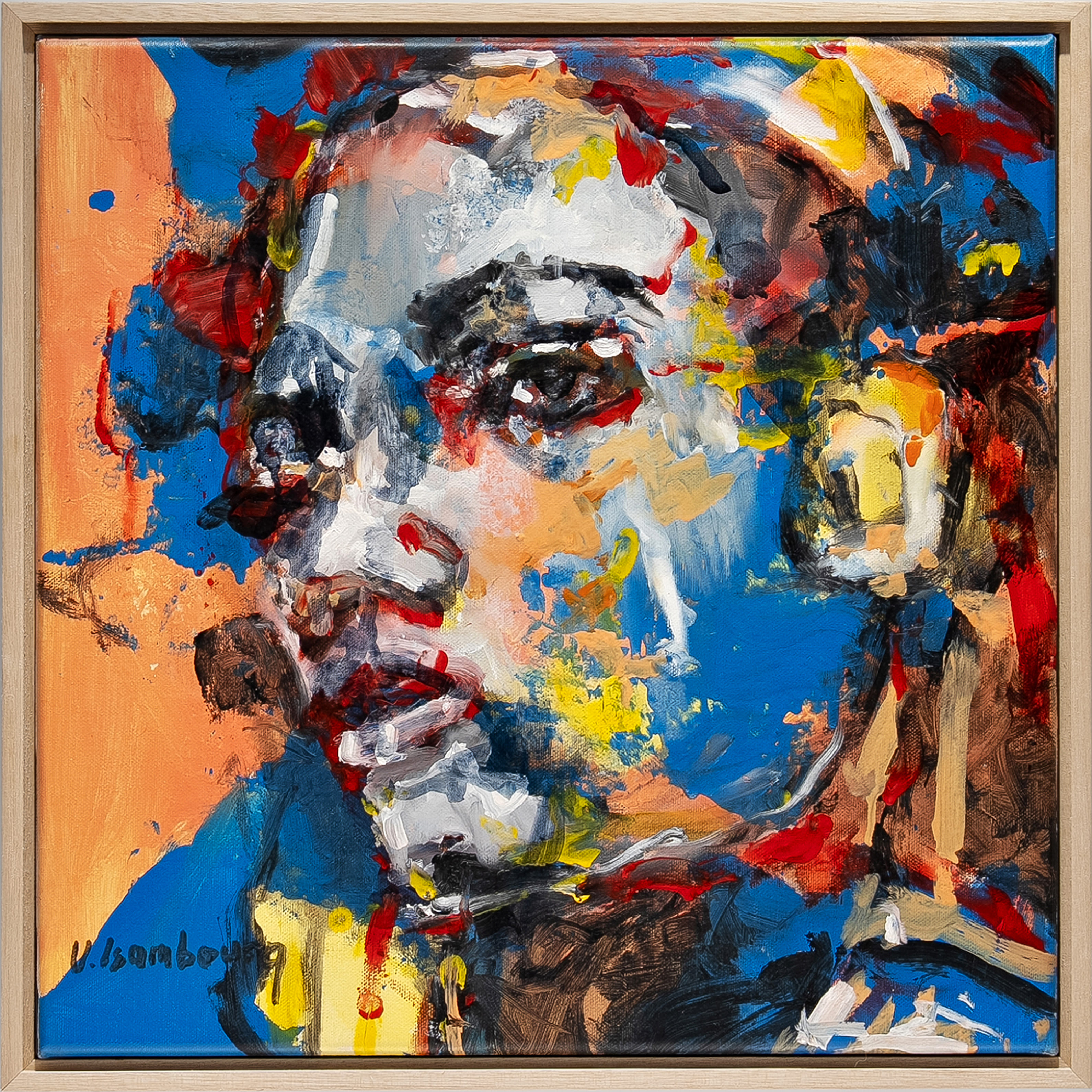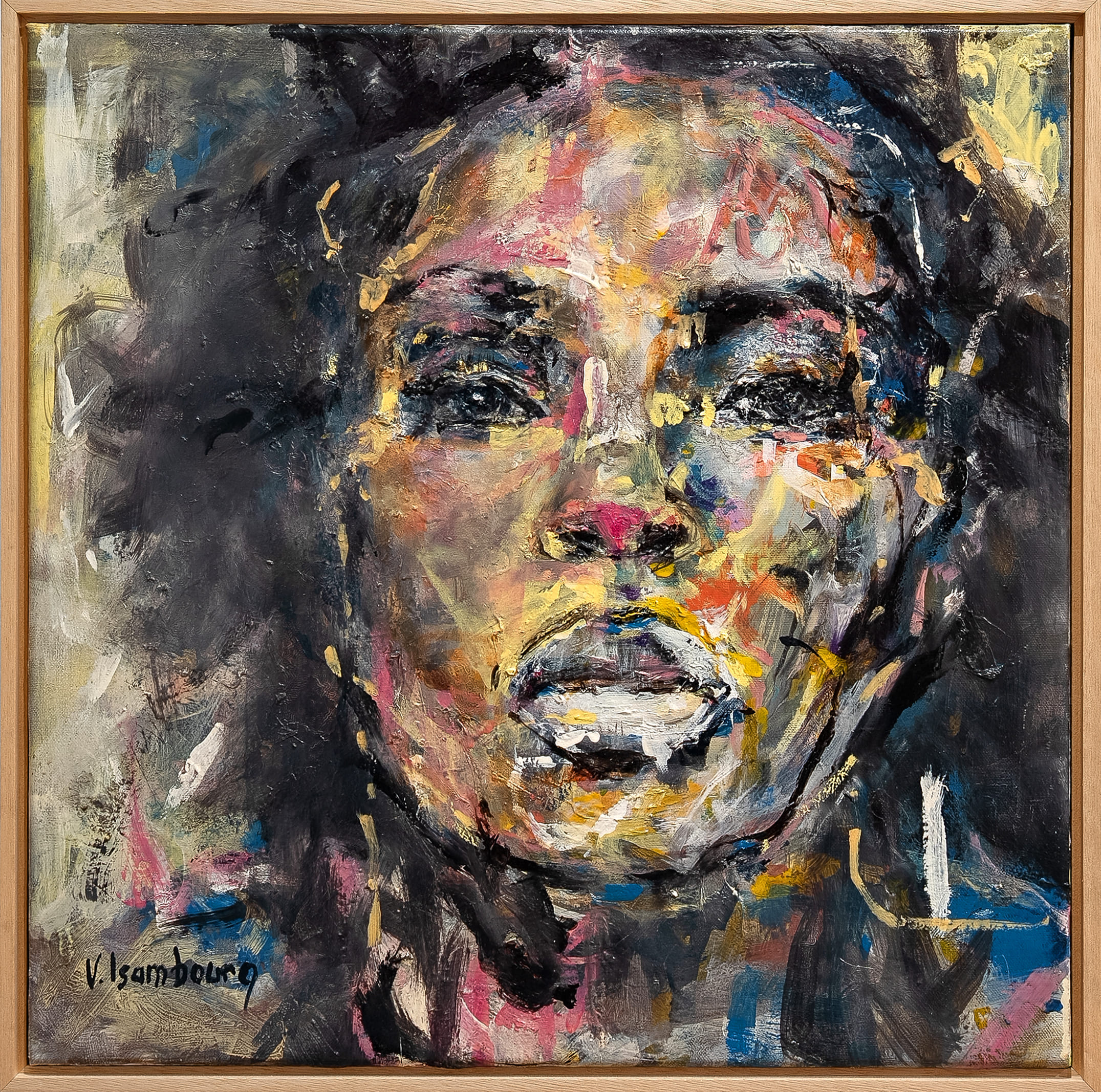 In The Colours of the Soul, Vincent Isambourg presents a portrait of an African woman shaped through bold chromatic contrasts and gestural application of oil paint. The layered surface allows colour to articulate emotion and interior presence, dissolving precise contours in favour of expressive intensity.