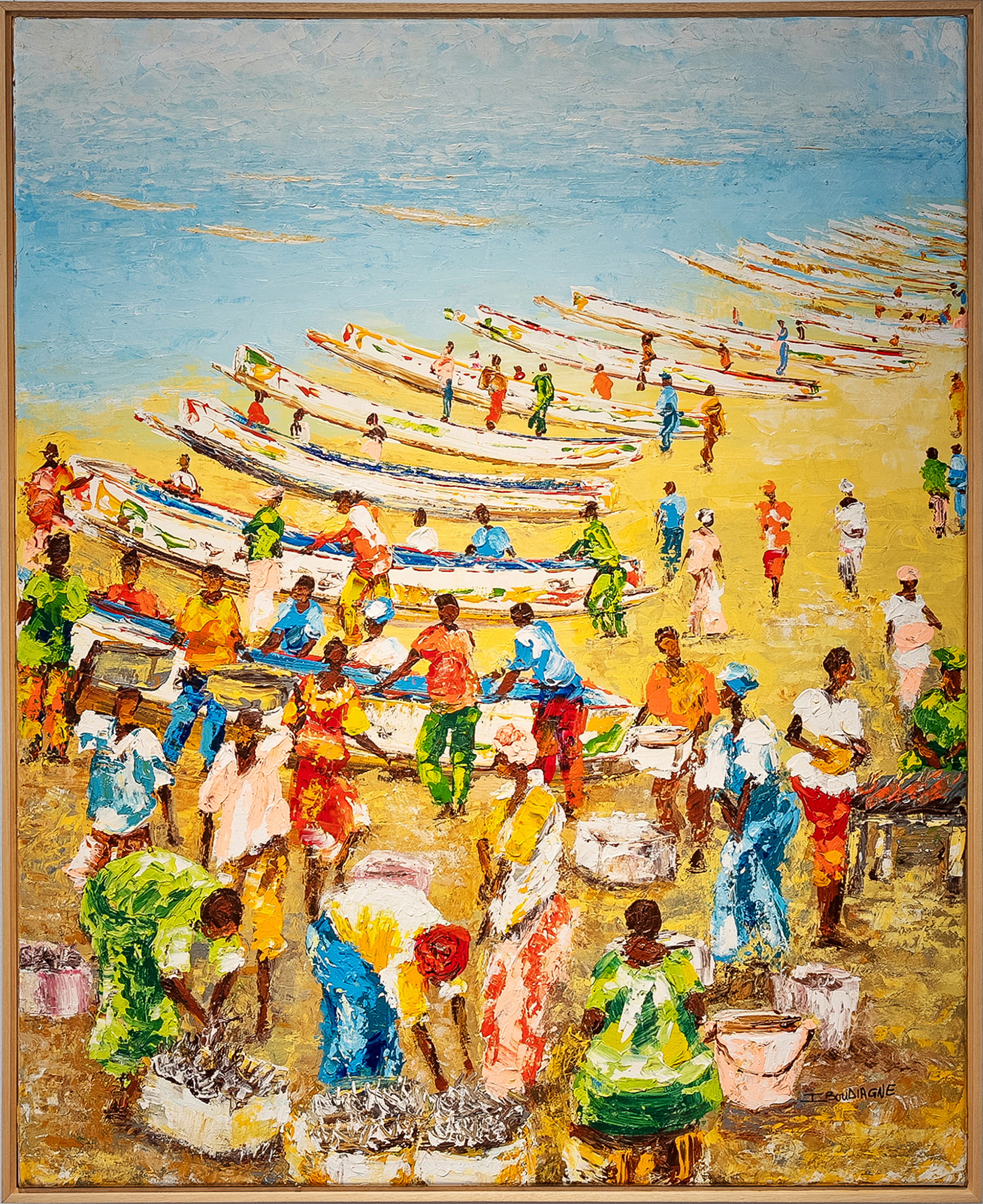 In Fishing Pier, Ibou Diagne depicts the activity of a coastal landing site where boats, vendors, and fishermen converge in continuous movement. Through luminous colour and gestural brushwork, the composition evokes the rhythm of labour and the collective energy shaping the shoreline.