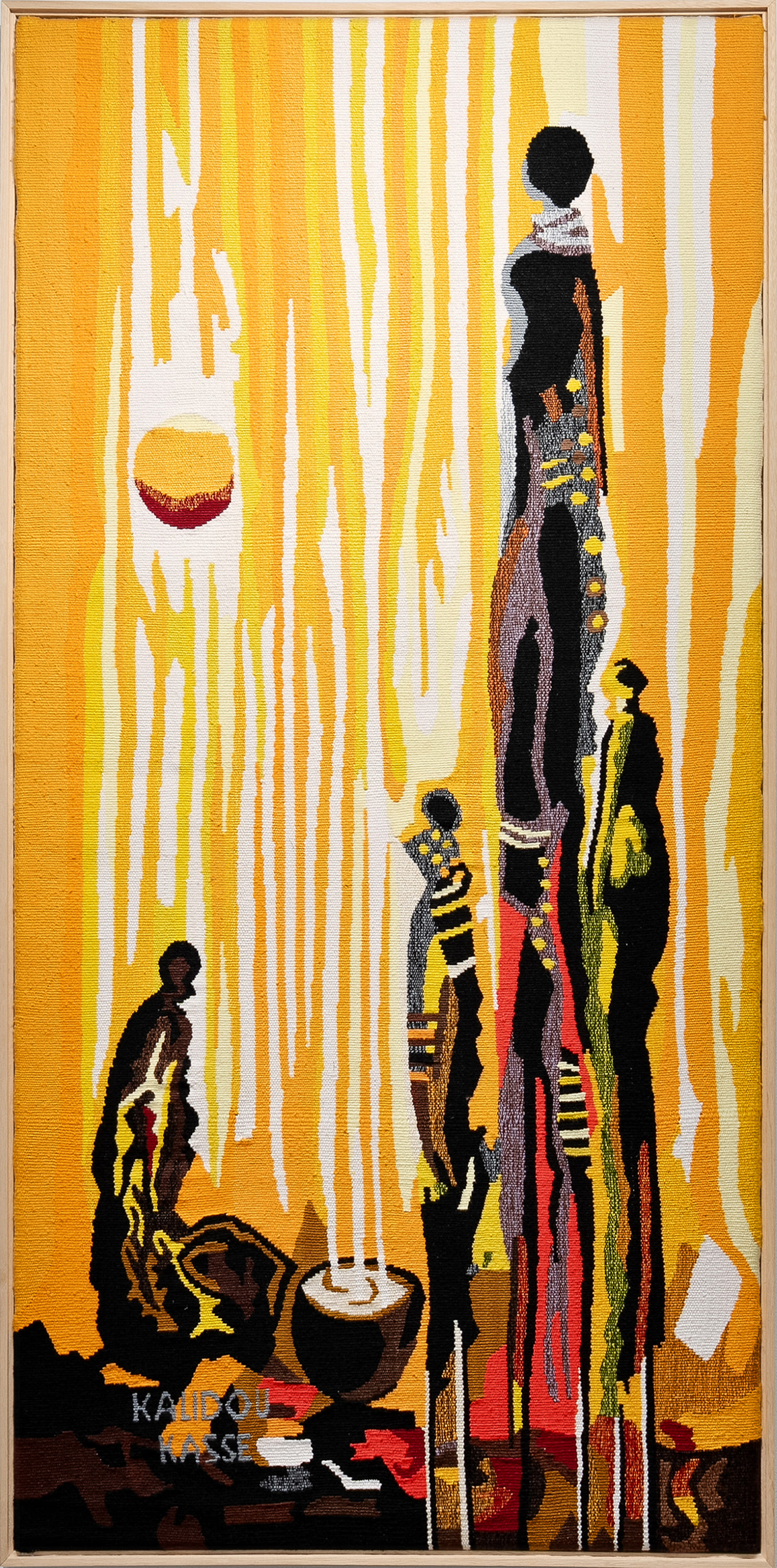 In The Blessed Child, Kalidou Kassé presents a vertical composition structured around elongated figures rendered in symbolic stillness. Through simplified forms and a restrained chromatic field, the work evokes spiritual presence and generational continuity within a ceremonial atmosphere.