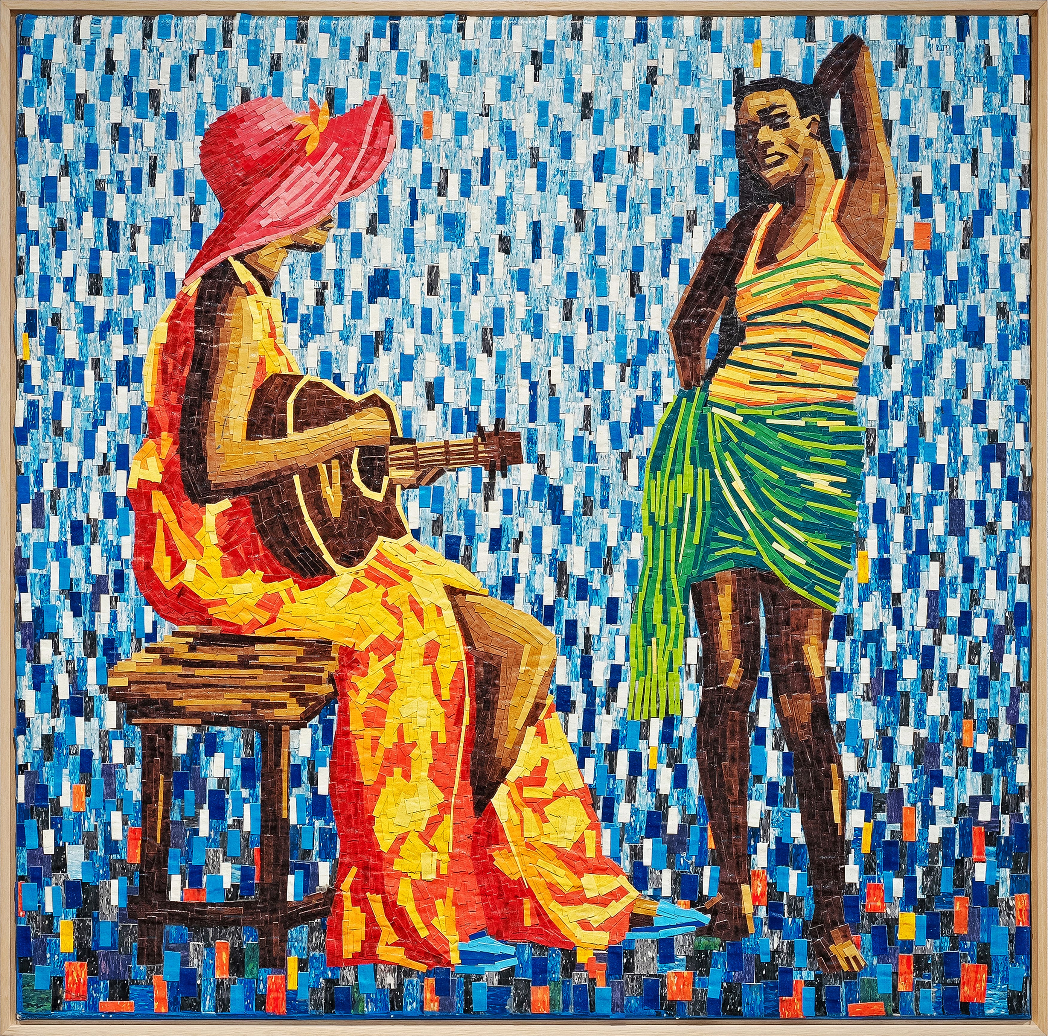 In Dance and Rhythm, Opa Bathily portrays a musician and a dancer engaged in a moment of exchange shaped by movement and sound. Through vibrant colour and layered composition, the work conveys rhythm as both structure and lived expression.