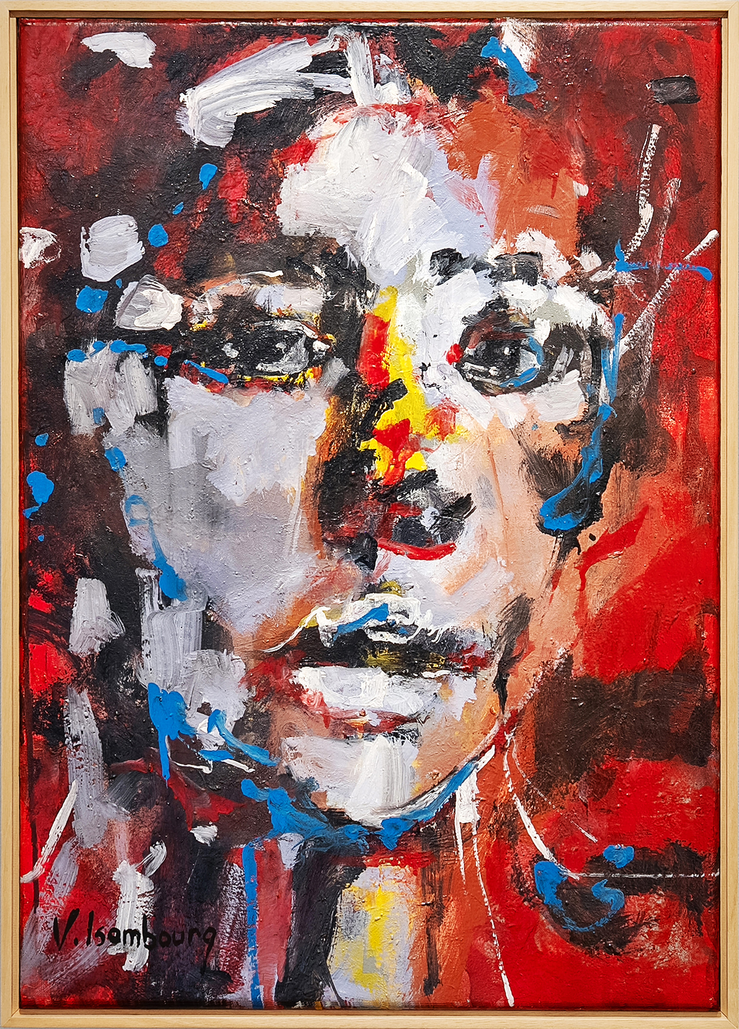 In Red, Vincent Isambourg presents a portrait of an African woman shaped by intense chromatic contrasts and gestural layers of oil paint. The dominance of red tones heightens emotional presence, while the textured surface allows expression to emerge through colour and material force.
