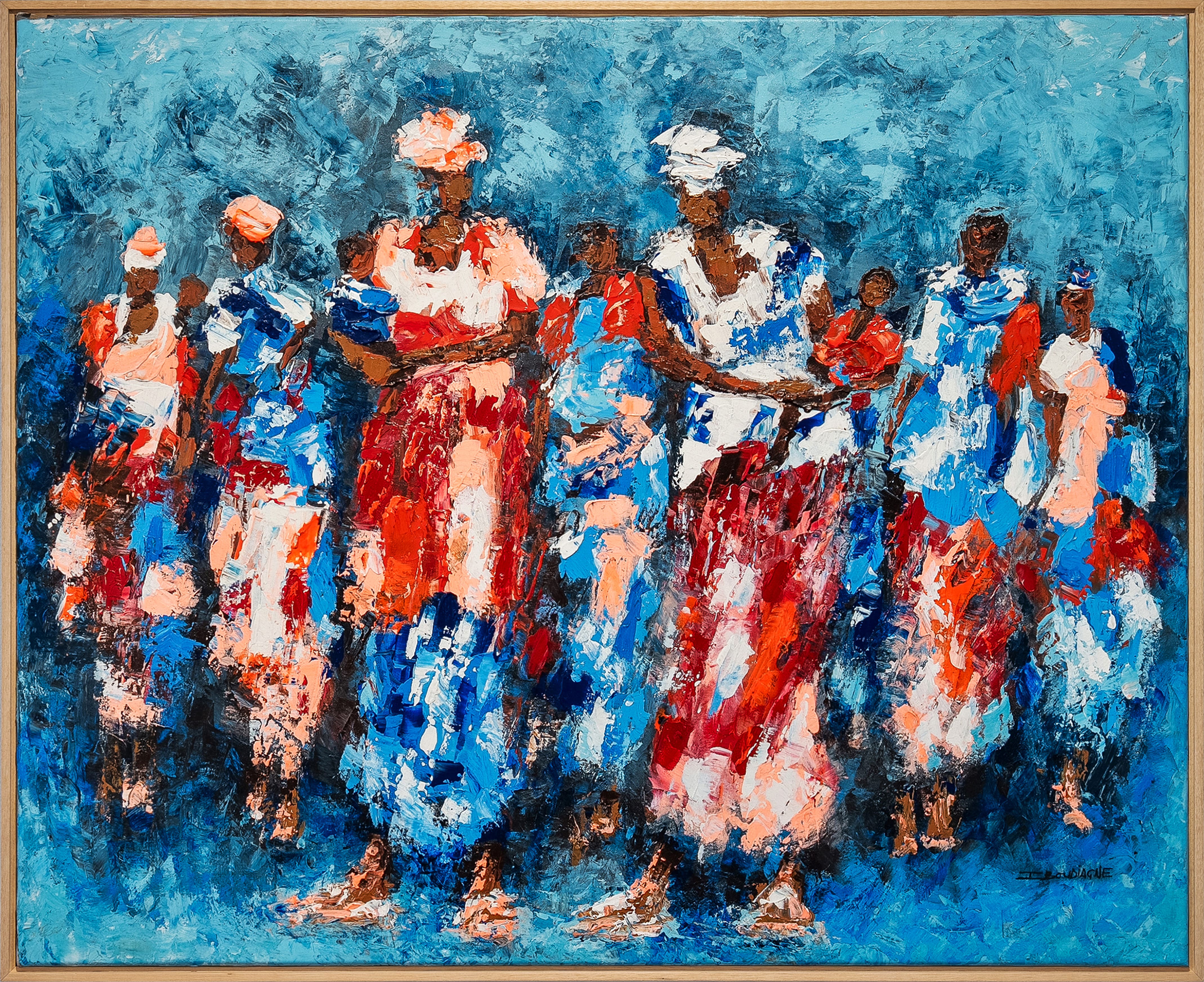 In Hope, Ibou Diagne portrays a group of women moving forward together, their upright postures suggesting quiet strength and collective resilience. Through layered brushwork and luminous chromatic contrasts, the composition evokes dignity, solidarity, and the enduring presence of optimism within shared experience.