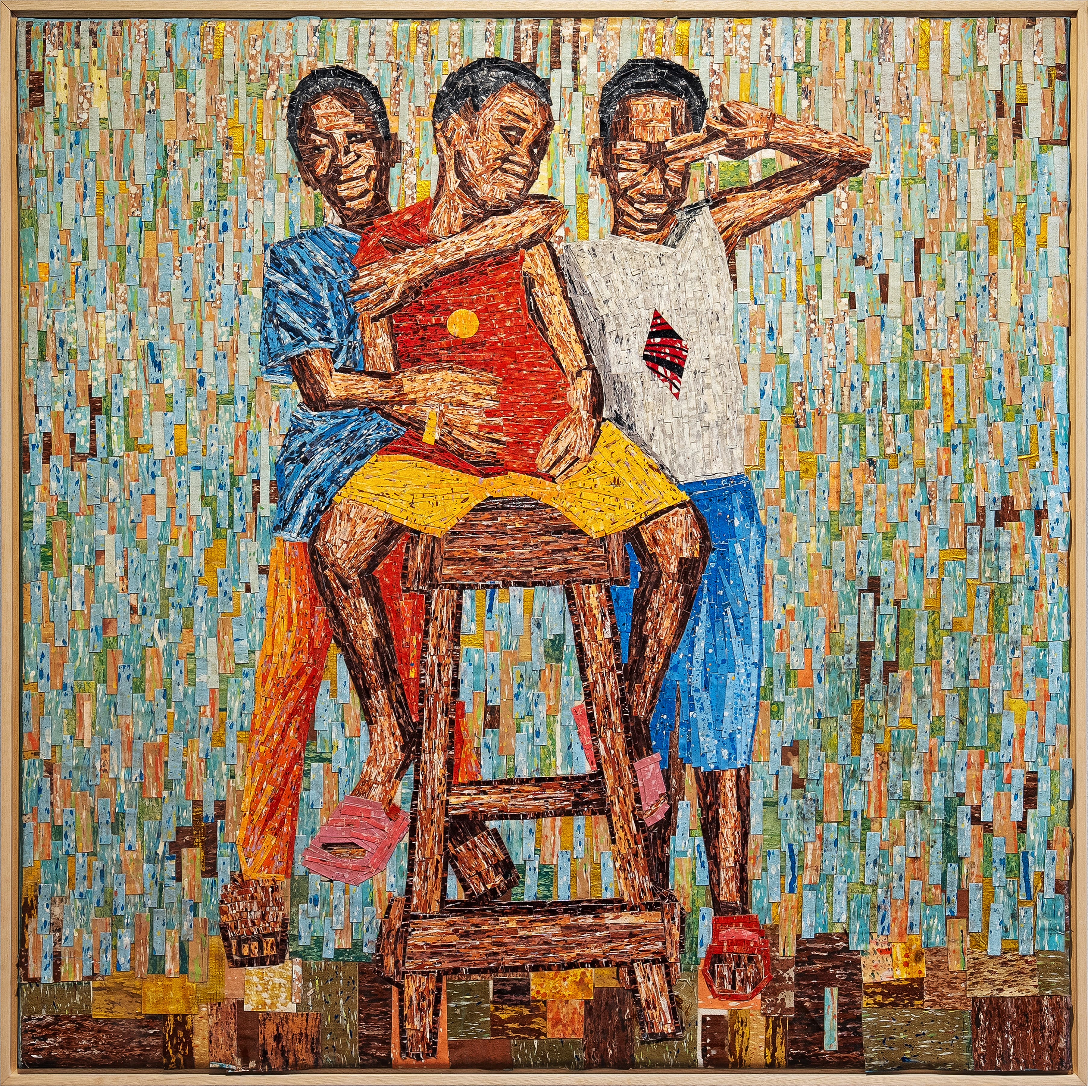 In Forever Accomplices, Opa Bathily presents three closely gathered figures whose gestures suggest intimacy and enduring loyalty. The layered fragments and tonal contrasts create a textured surface that reflects shared experience and collective presence.