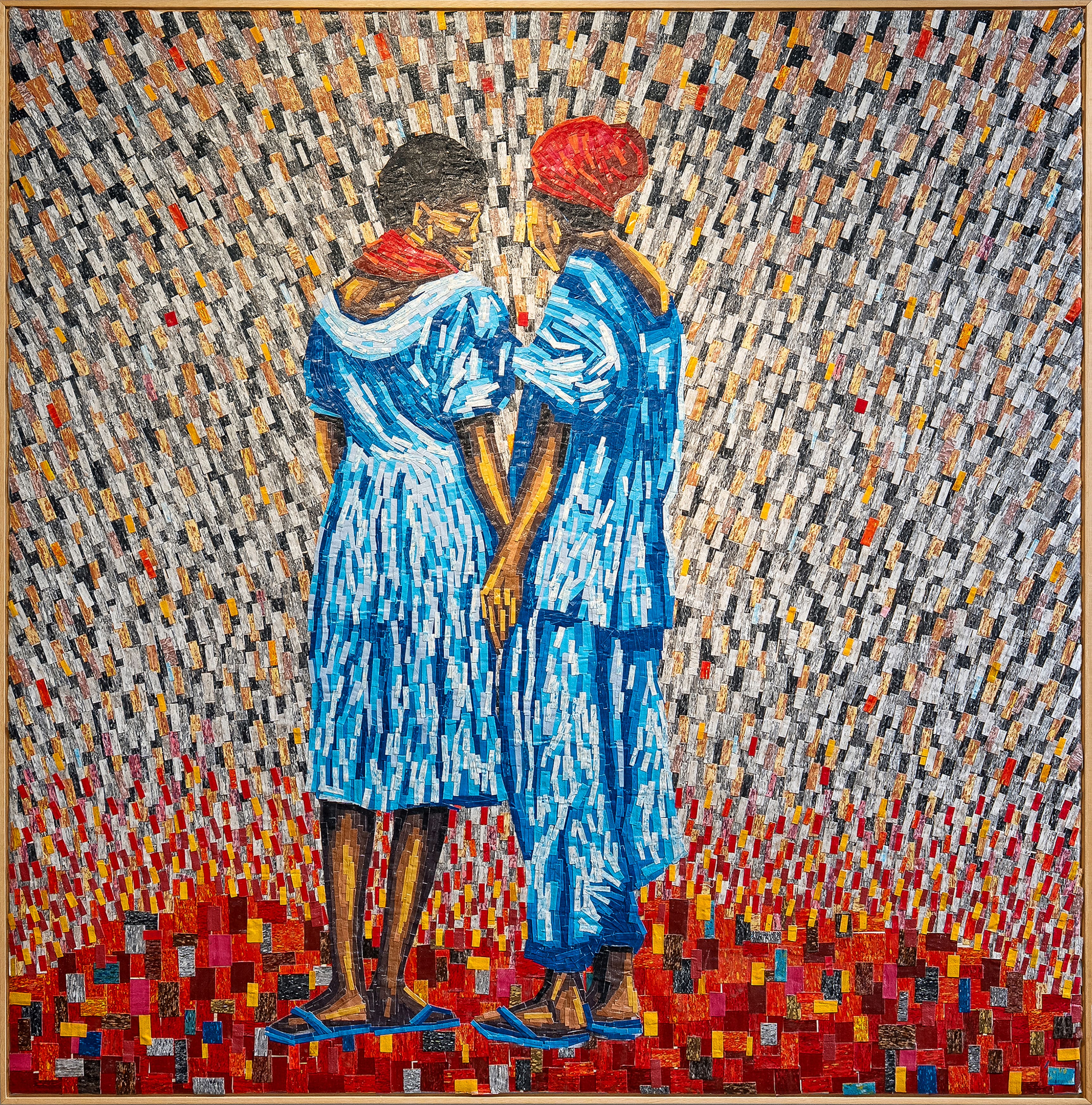 In N’Terini (The Childhood Friend), Opa Bathily reflects on memory and quiet companionship through layered painted fabric fragments. The two figures, standing side by side, suggest a bond shaped by shared history and unspoken understanding, balancing intimacy with subtle distance.