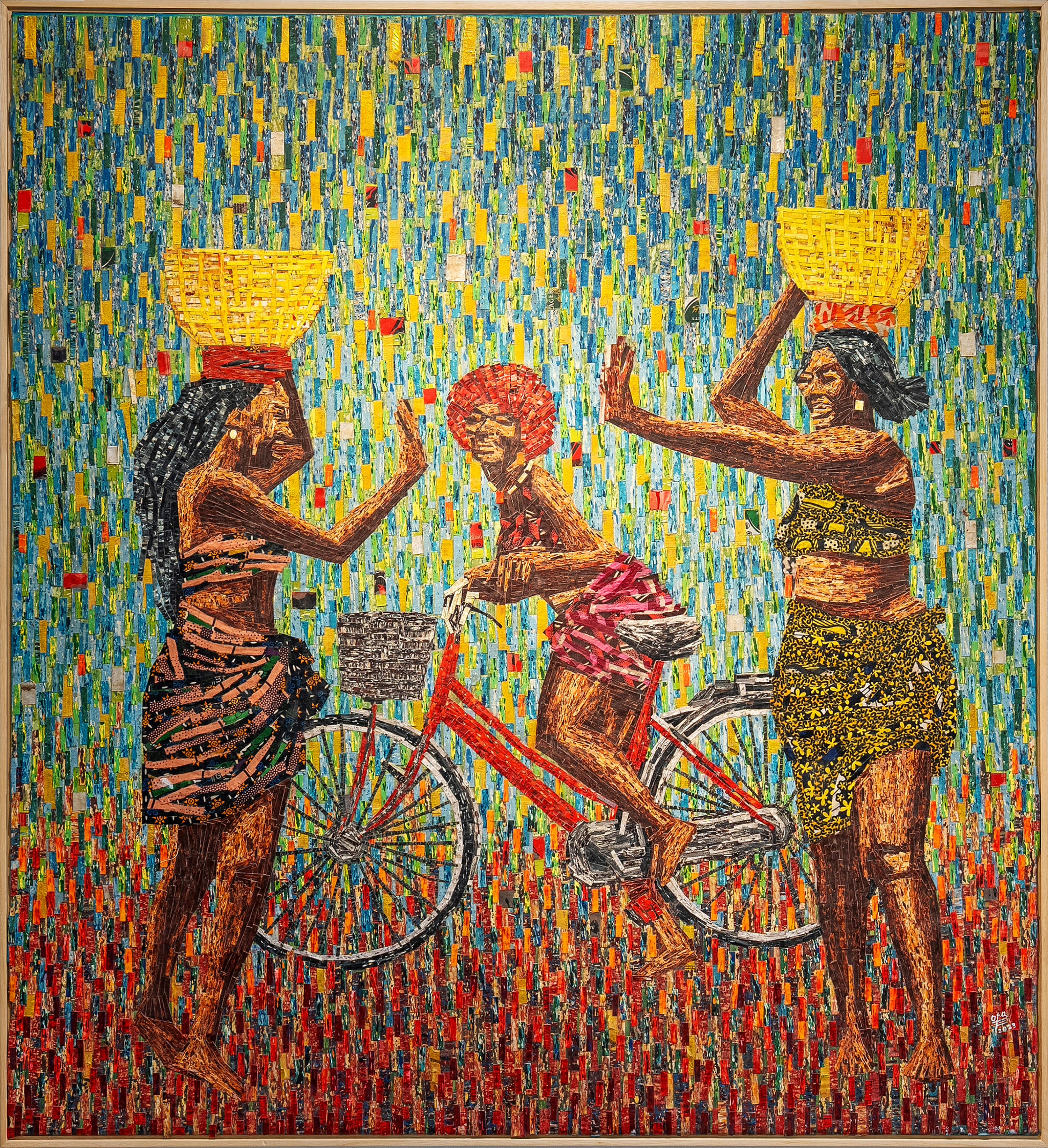 In On the Way Back from the Market, Opa Bathily depicts three women returning from the market, their woven baskets marking the rhythm of daily labour and shared routine. Through layered colour and textured surfaces, the work evokes vitality, solidarity, and the quiet dignity of everyday life.