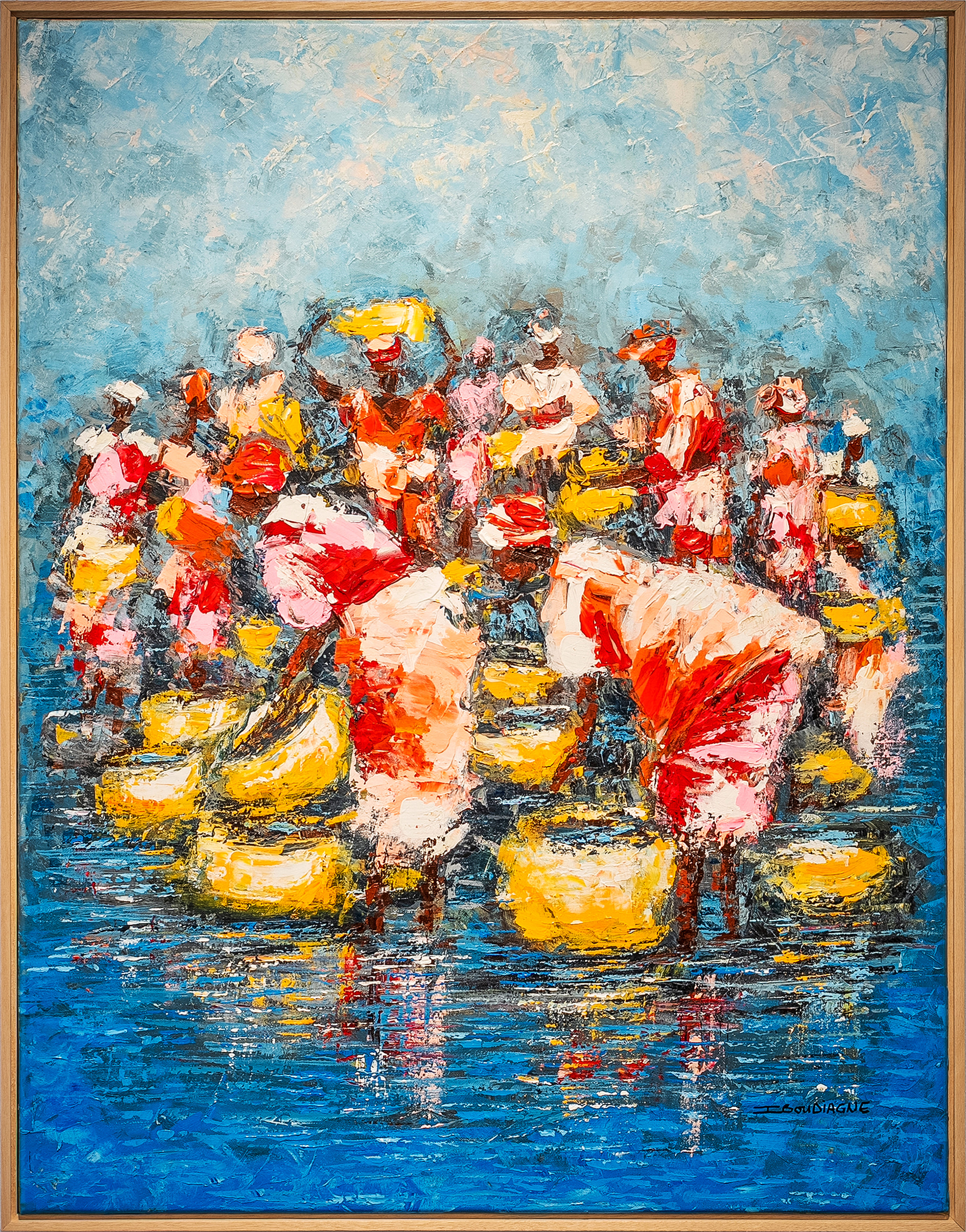 In Rotti, Ibou Diagne depicts a group of women gathered in shallow water, their gestures suggesting labour shaped by routine and collective presence. Through fluid brushwork and vibrant tonal contrasts, the composition evokes movement, reflection, and the rhythmic cadence of shared activity.